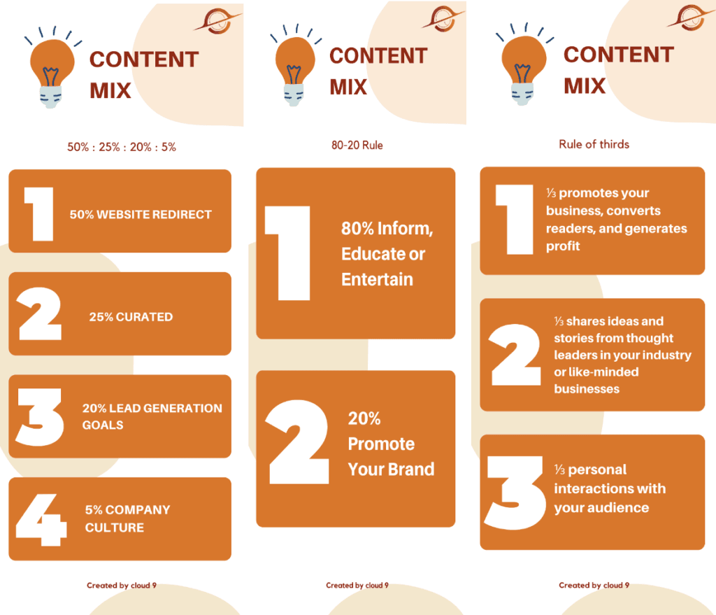 Once you are done with setting SMART goals and creating Mission Statements you should now start creating the content mix for your brand. So there are many rules that are followed by various brands to create a content mix. What specifically is a content mix, in a content mix a brand defines how and what type of content can be circulated among their audience should it be curated, advertisements, website redirects, or in-house created content. Every brand can define the consistency and type of content they can create but given are some examples that are mostly followed to create content
